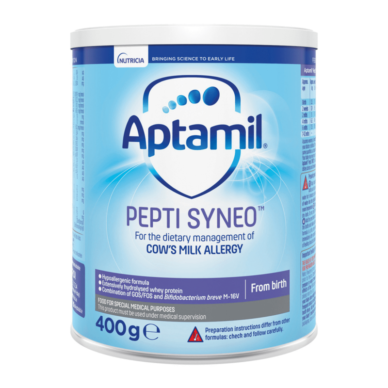 Aptamil Pepti Syneo is a Food for Special Medical Purposes for use under medical supervision. Aptamil Pepti Syneo is a whey-based extensively hydrolysed formula with galacto- and fructo- oligosaccharides (GOS/FOS) and Bifidobacterium breve M-16V, for the dietary management of cow’s milk allergy. Aptamil Pepti Syneo is a nutritionally complete hypoallergenic formula, suitable for infants from birth. Suitable as a sole source of nutrition up to 6 months of age, and/or as part of a balanced diet from 6 months.