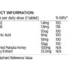 Bulking Agents (Dicalcium Phosphate, Microcrystalline Cellulose), Freeze Dried Manuka Honey (Maltodextrin), Royal Jelly 3:1 Extract, Zinc Oxide, Pantothenic Acid (Vitamin B5 as Calcium Pantothenate), Sodium Selenite, Glazing Agent (Hydroxypropyl Methyl), Anti-Caking Agent (Silicon Dioxide), Anti-Caking Agent (Magnesium Stearate), Vitamin B6 (Pyridoxine Hydrochloride), Vitamin B2 (Riboflavin), Glazing Agents (Glycerin, Carnauba Wax), Biotin.