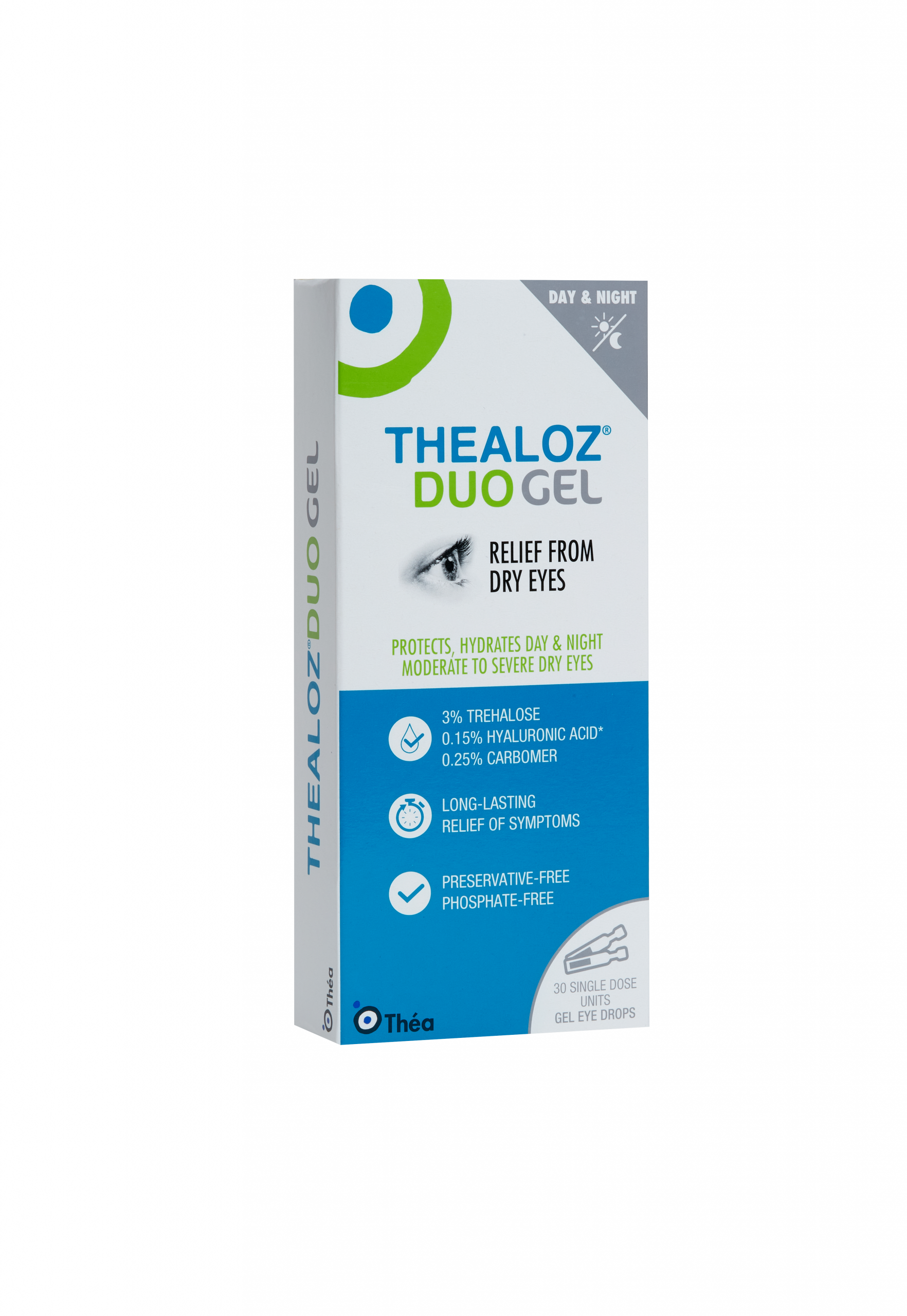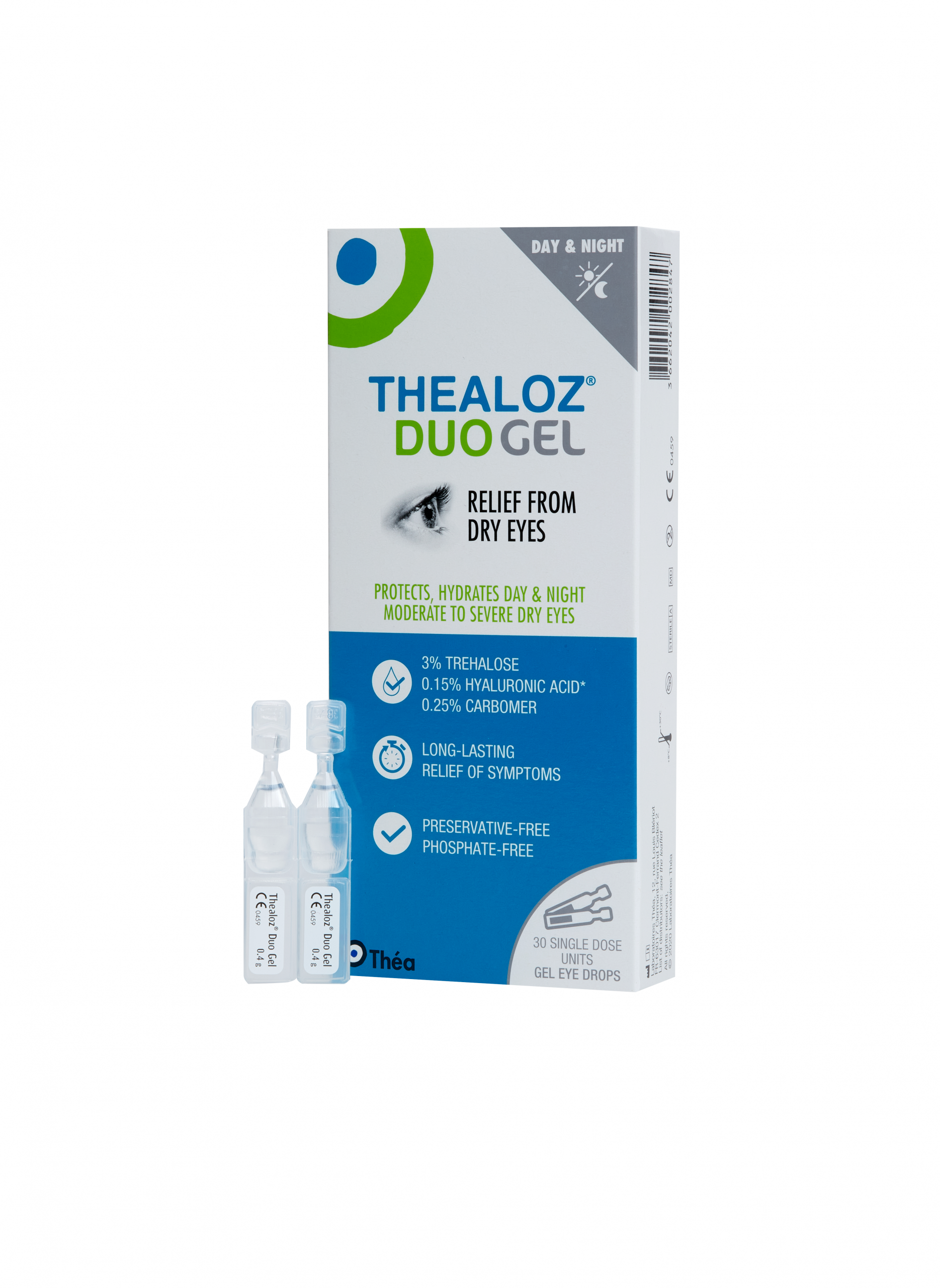 •  Thealoz Duo Gel contains trehalose 3%, sodium hyaluronate 0.15% and carbomer 0.25% in a preservative free gel formulation